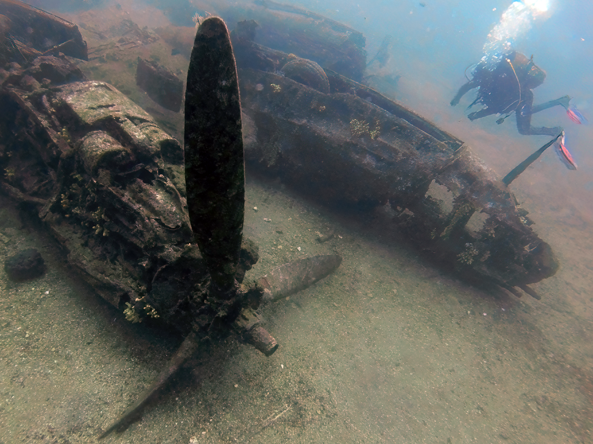 Très belle épave que ce chasseur bombradier de l'US Air Force, abattu le 27/01/1944 au-dessus de la Baie des Lecques. Le pilote s'en est sorti, son avion repose maintenant sur le dos à 40 m. St-Cyr sur Mer, 18/05/2025