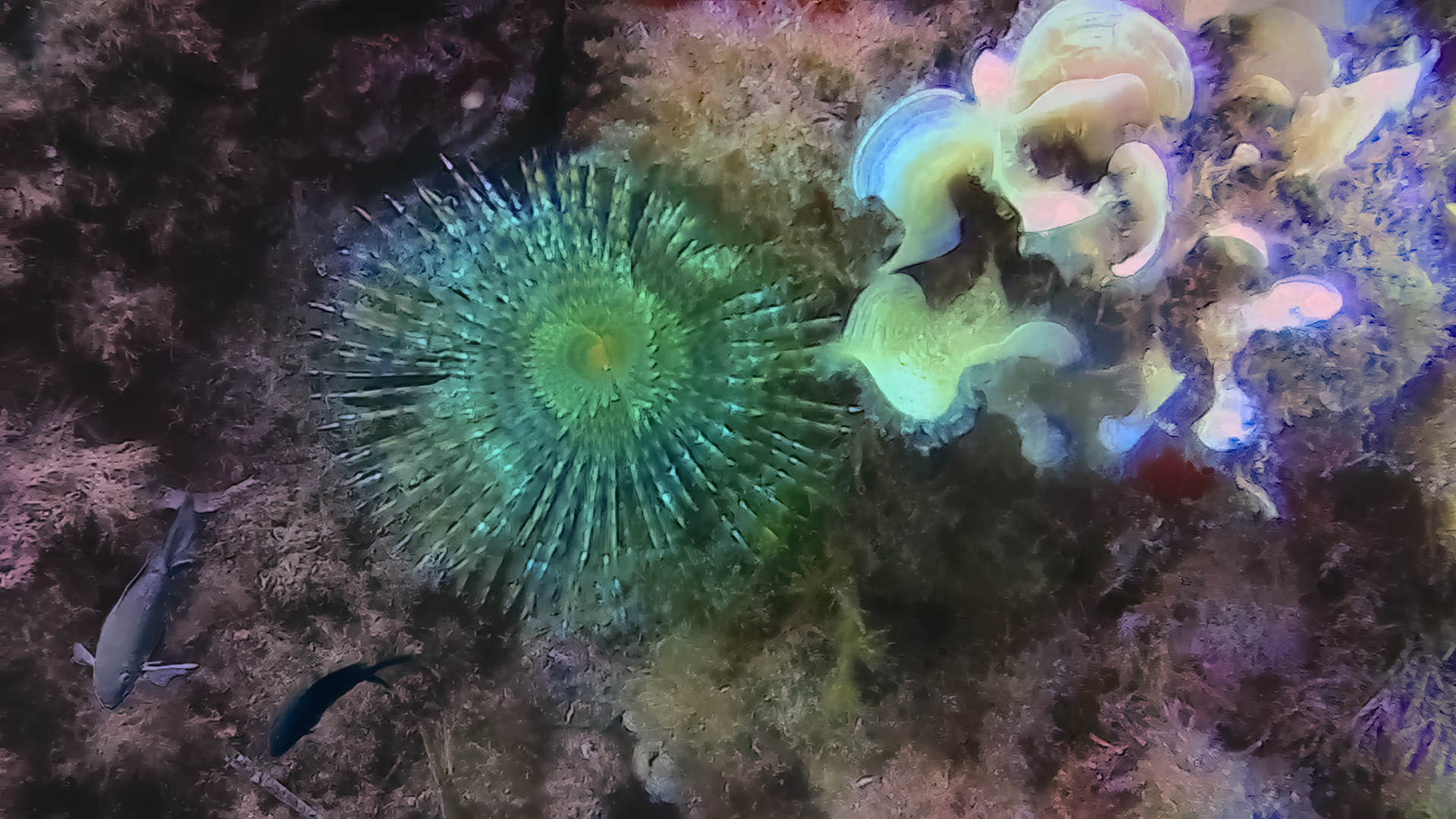 Perché sur son rocher, ce ver marin annélide se rétracte à la moindre vibration (menace) dans son tube d'une vingaine de cms, qu'il fabrique lui-même. Son panache branchial filamenteux se compose de spires de centaines de fils. Fréjus, 21/07/2024.
