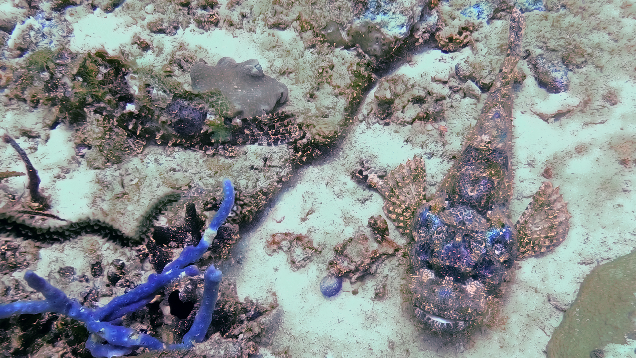 Si l'on identifie bien l'indvidu qui nous fait face, on ne perçoit pas tout de suite celui de gauche, horizontal sur la photo. Ces scorpaenidés (Scopaenidae) sont, comme leurs congénères, venimeux et doués d'un art réel du camouflage. Maldives, 24/02/2025.#LIGNE2