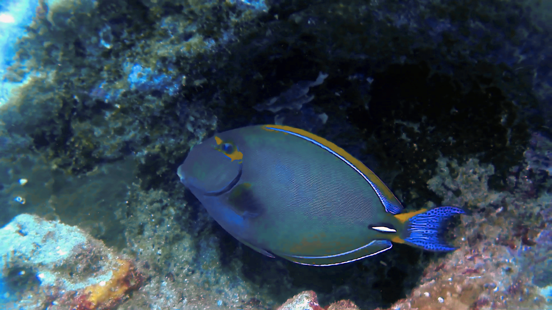Il existe un très grand nombre de variétés de poissons chirurgiens tropicaux ; ici, le Acanthuridaer, qui se caractérise par des éperons tranchants sur la queue. Saint-Gilles, La Réunion, 17/05/2023.