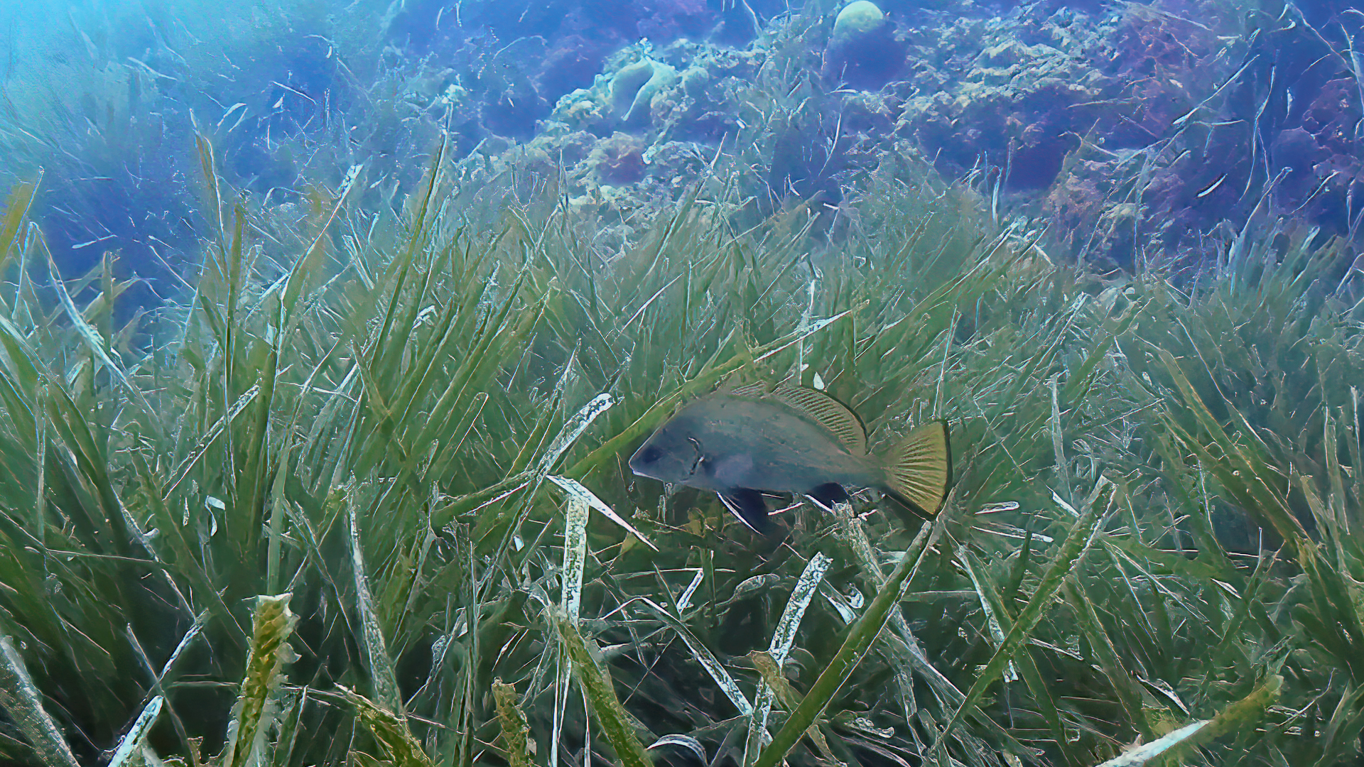 Ce poisson typiquement méditerranéen, reconnaissable par le liseret sombre bordant ses nageoires dorsale et caudale, vit en bande près des rochers, failles où il peut aisément se cacher. St-Cyr sur Mer, 18/05/2025.