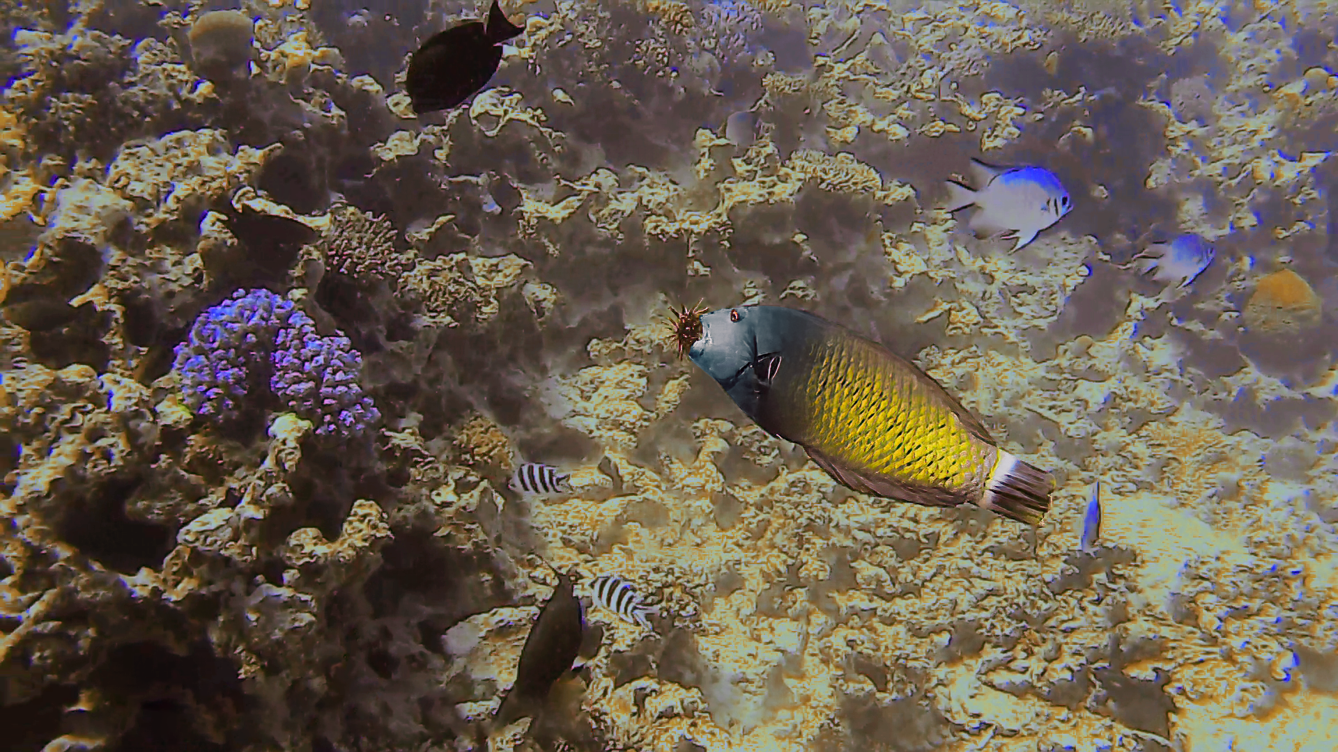 Certainement heureux de sa prise, ce labre pavane après avoir capturé un oursin qu'il transporte sans gêne apparente dans sa gueule. Hurghada, Mer Rouge Egypte.11/03/2024.