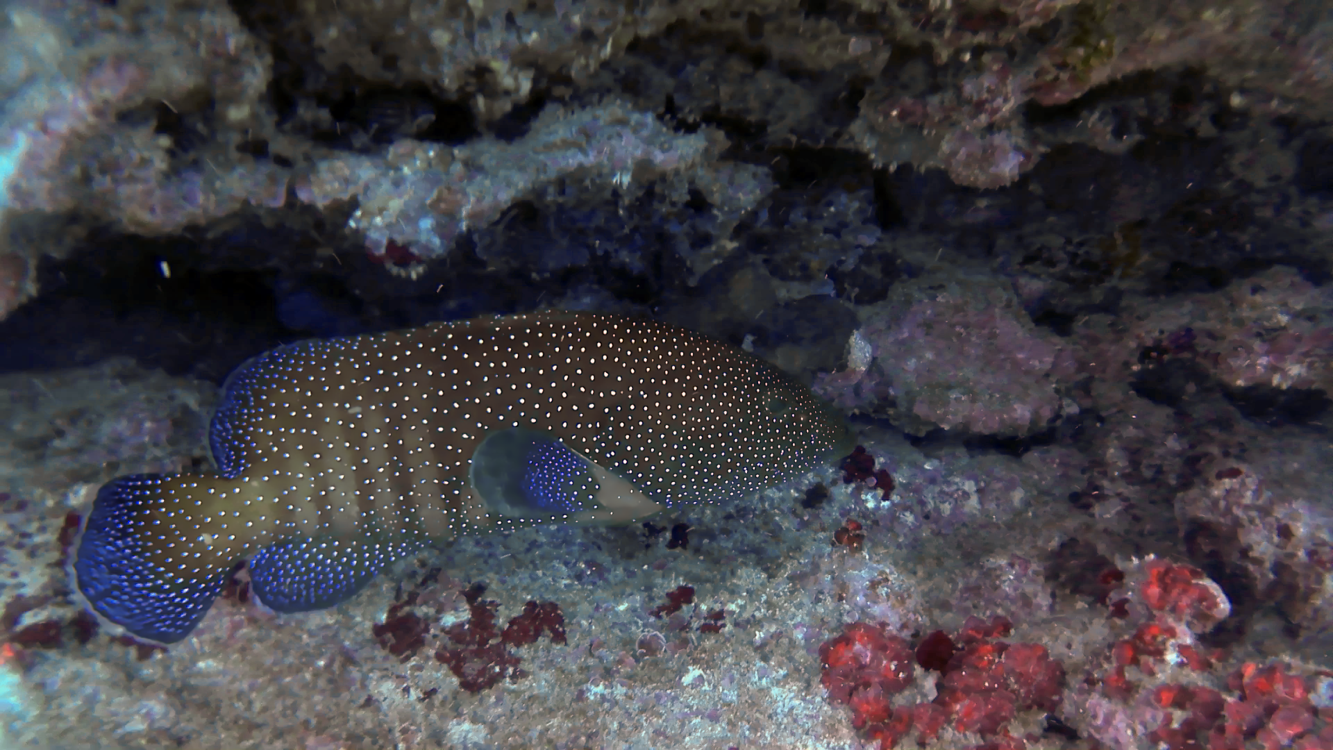 Quand on est amateur d'astronomie, on ne peut qu'admirer la robe étoilée de ce Serranidae qui est l'un des mérous dont l'aire de répartition est la plus vaste. St-Gilles, La Réunion, 22/05/2023.