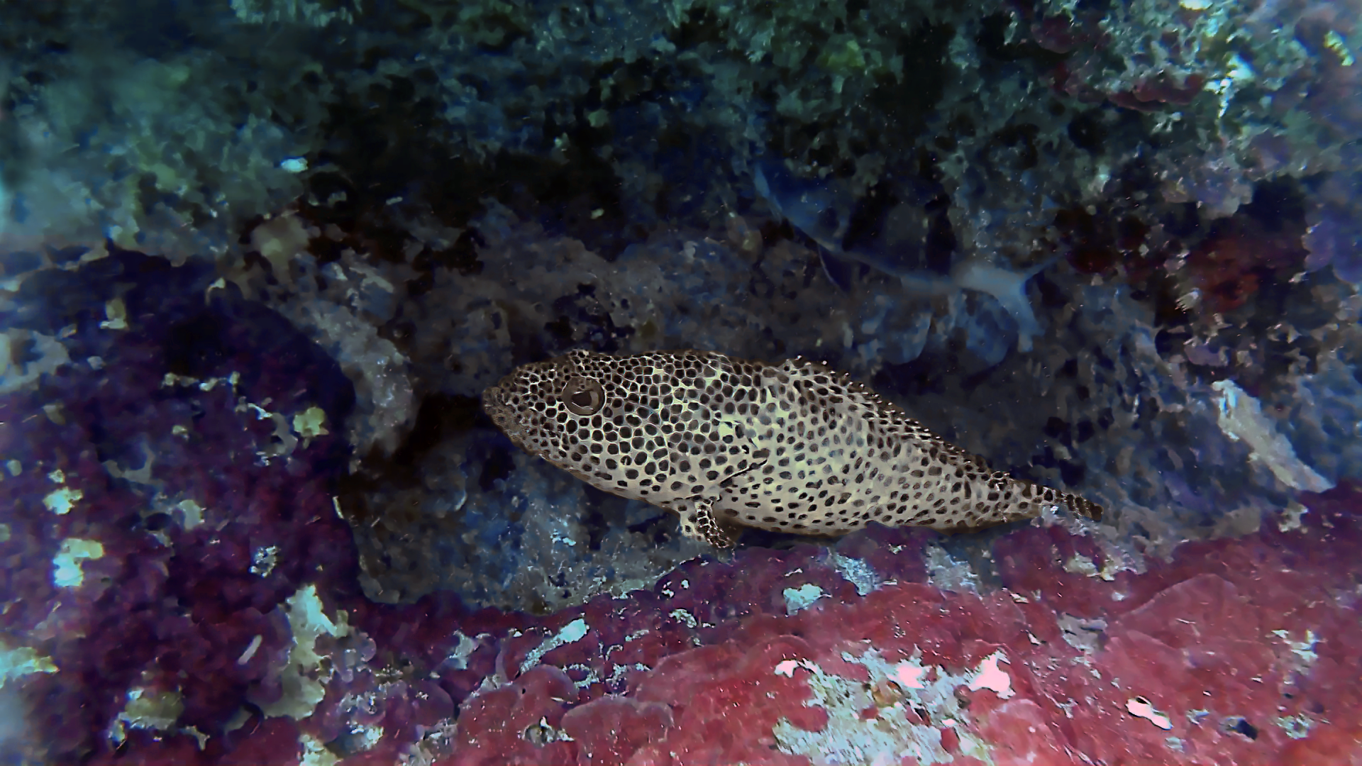 Ce petit mérou carnassier ne dépasse guère la trentaine de cms pour un poids maximum de 1 kg. Assez farouche, il se cache volontiers à l'approche d'un visiteur. St-Gilles, La Réunion, 23/05/2023.