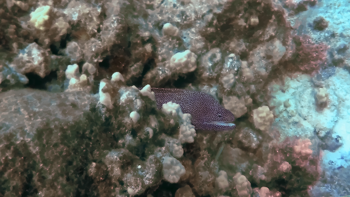 Cette murène pintade (ou murène perlée, Gymnothorax meleagris) vit dans le le bassin Indo-Pacifique où elle semble assez rare, sauf à Hawaii où cette photo a justement été prise. Hawaii, 17/05/2022.