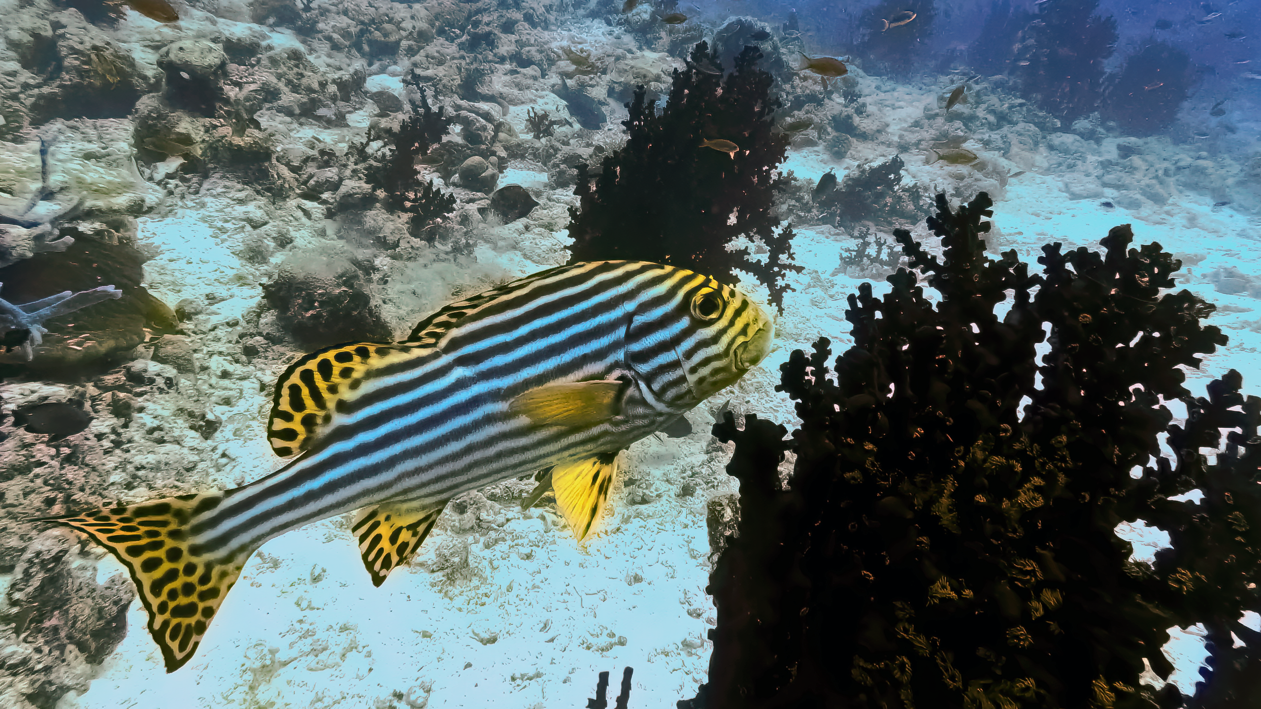 Joli poisson que ce "diagramme oriental", coloré à pois et à rayures, dont l'aspect lui vaut d'être aussi appelé gatherin bagnard ou zèbre oriental. Maldives, 20/02/2025.