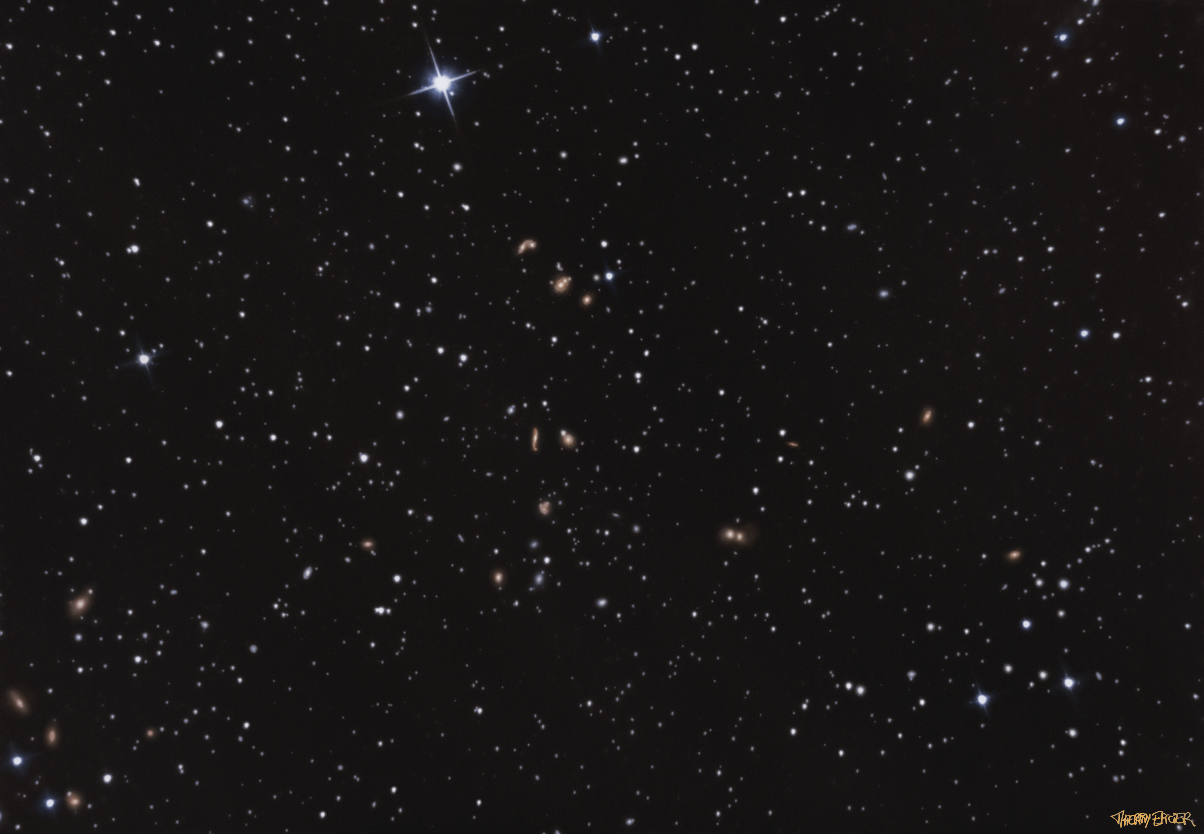 Abell 2151 est surnommé l'amas d'Hercule dans la constellation du même nom. Il contient autour de 200 galaxies et fait partie du filament galactique dit du 'Grand Mur' qui relie de très nopmbreux amas dans le supermas d'Hercule. Les 2 galaxies les plus brillantes de cet ams, NGC 6050 et IC 1179 (le doublet le plus proche de l'étoile brillante en haut), sont des galaxies spirales en interaction à 450 millions d'années-lumière de la Terre ; elles constituent l'objet 272 de l'Atlas of Peculiar Galaxies (atlas Arp produit par l'astronome Halton Arp), qui recense 338 galaxies particulières. 3 h. de pose le 16 Juin 2023 à Pernes-les-Fontaines, 84210.