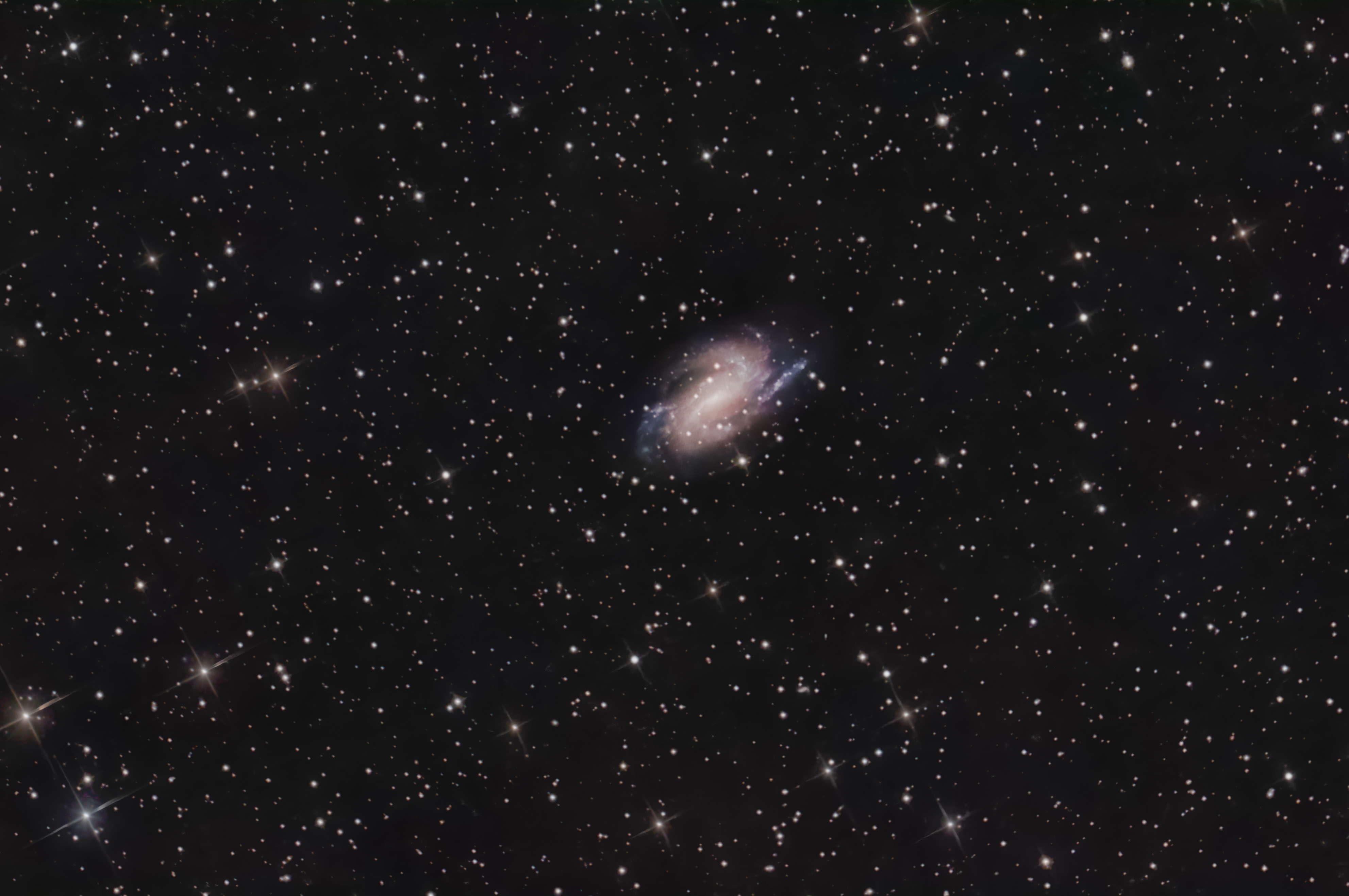 NGC 925 est une galaxie spirale barrée à environ 30 millions d'A.L. dans la constellation du Triangle. Elle a été découverte par l'astronome germano-britannique William Herschel en septembre 1784. Avec ses 2 bras dissymétriques et sa barre déclalée, cette galaxie est un exemple typique de galaxie spirale de Malgellan. Son centre allongé est le siège de la formation d'étoiles sur toute son étendue. NGC925 nous apparait inclinée de 55° ; sa taille est d'environ 96000 A.L., sa magnitude est de 10.1. 10 heures de pose (mix de poses de 30 s pur les étoiles et 360 s pour la galaxie) du 22 au 24 septembre 2025. F-84210 Pernes-les-Fontaines.