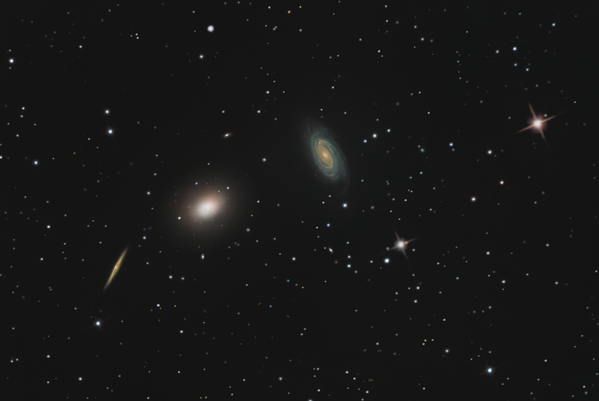 Le trio du Dragon, trop petit ppur être qualifié d'amas, se compose de galaxies distantes de 100 à 140 millions d'A/L/ de la Terre ; plusieurs galaxies plus lointaines sont également discernables. De gauche à droite : galaxie spirale NGC 5981 découverte par le physicien irlandais George Stoney en 1850 (magnitude 13, vue sur la tranche), galaxie elliptique NGC 5982 découverte par l'astronome germano-britannique William Herschel en 1788 (mag. 11.1) et galaxie spirale barrée vue de face NGC 5985 (mag. 11.1, également découverte par W. Herschel en 1788). Pose de 9h20 (expositions élémentaires de 360 s pour le fond de ciel et 30 s pour les étoiles) entre le 10 et le 19 mai 2024. F-84210 Pernes-les-Fontaines.