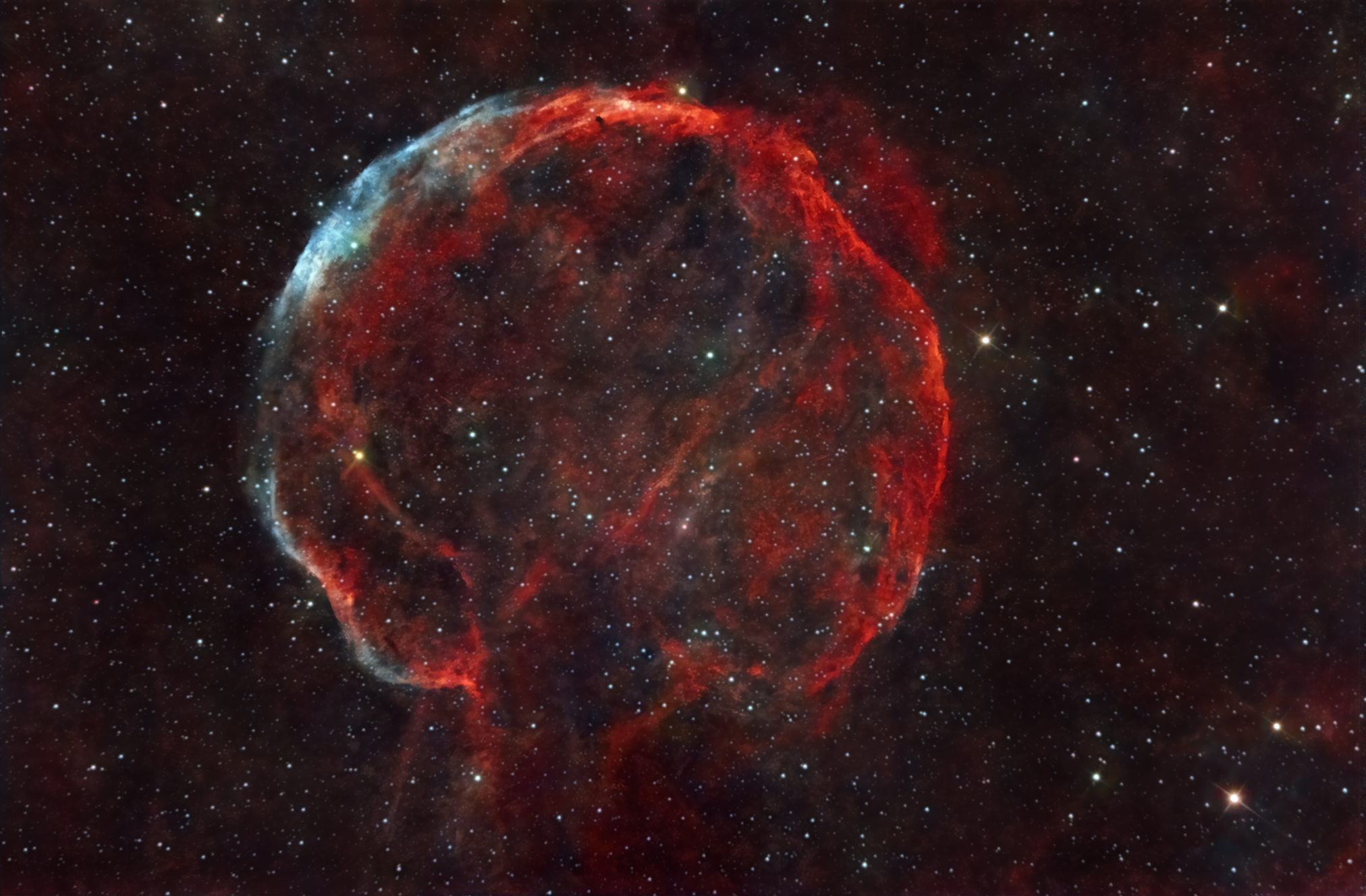 La nébuleuse LBN 576 est un rémanent de supernova, c'est-dire l'enveloppe gaseuse laissée par l'explosion d'une étoile massive dan la constellation de Cassiopée il y a quelques 10 000 ans. Situé à 9800 A.L. et de diamètre environ 98 A.L., ce bel objet de faible intensité nécessite l'emploi de 2 filtres pour capturer les nébulosités rouges (Ha) et la mince couronne bleutée (OIII). 26 heures de pose avec filtre L-extreme et 5 heures en OIII, entre le 12 et le 17 septembre 2024. F-84210 Pernes-les-Fontaines.