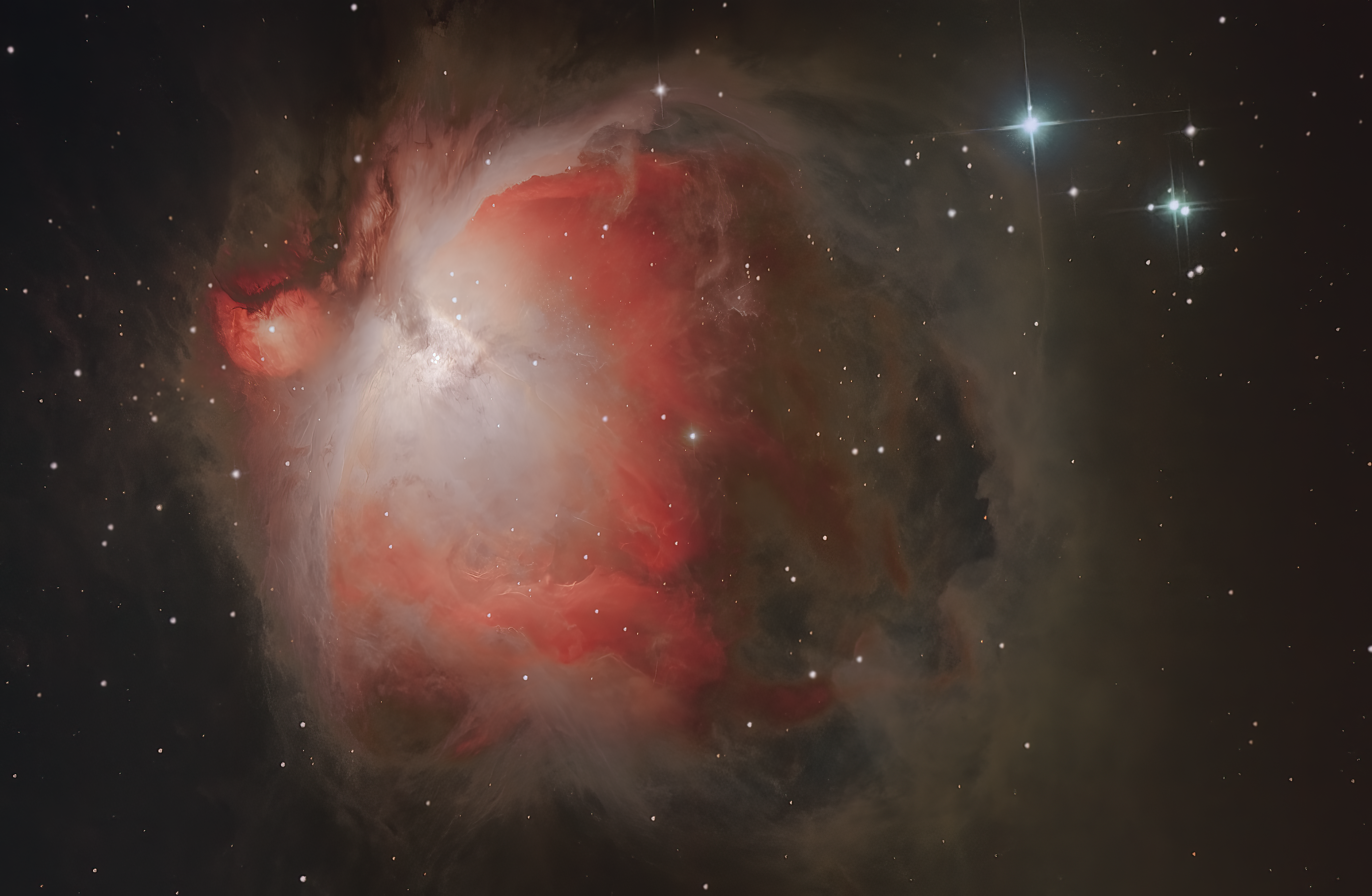 M42 est la nébuleuse d'Orion (NGC1976), située sous la ceinture de la constellation d'Orion au sein de la Voie Lactée. Nébuleuse diffuse en émission et en réflexion, elle est le siège de sursauts de formation d'étoiles ; elle renferme une bulle de gaz extrêmement chaud à 2 mlillions de degrés Celsius ! Une des stars du ciel dans l'hémisphère nord... Considérée comme abordable pour les débutants, car très lumineuse (magnitude 3.7) et facilement repérable, elle offre quelques difficultés pour bien contrôler l'exposition des nébulosités sombres en périphérie, tout en évitant de "griller" le coeur, et notamment la petite configuration d'étoiles jeunes dite du trapèze dans la partie la plus lumineuse. Découverte en 1610 par le français Nicolas-Claude Fabri de Peiresc. Taille 24 A.L., âge 3 millions d'années, située à 1340 A.L. de la Terre. Pose de 2h30 le 19 Novembre 2023, Pernes-les-Fontaines, 84210.