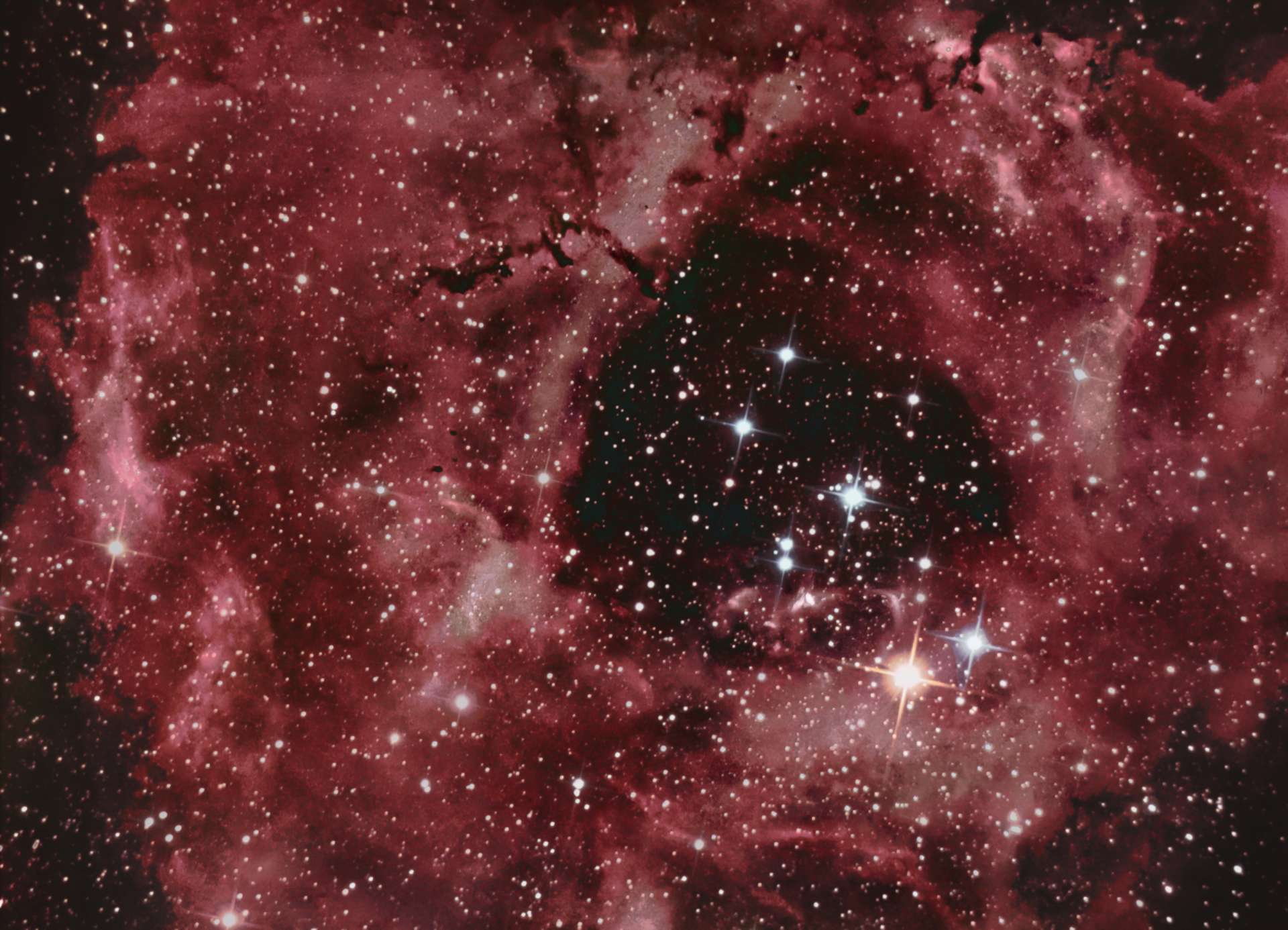 La nébuleuse de la Rosette, répertoriée comme NGC 2237 ou Caldwell 49, est une vaste région ionisée HII située à quelques 4 700 A.L. du système solaire en direction de la constellation de la Licorne. Elle apparaît comme fissurée par de minces lacets de poussière obscure. Massive comme 10 000 soleil, elle s'étend sur 130 A.L. dans sa plus grande dimension et ne rentre que partiellement dans le champ de vue d'un télescope de focale 1000. Pouponière d'étoiles actives, elle renferme plusieurs autres objets NGC, peu discernables avec la résolution présente. NGC 2237 a été découverte par l'astronome américain Lewis Swift en 1865. 7 heures d'exposition le 10 Février 2023 à Pernes-les-Fontaines, 84210.