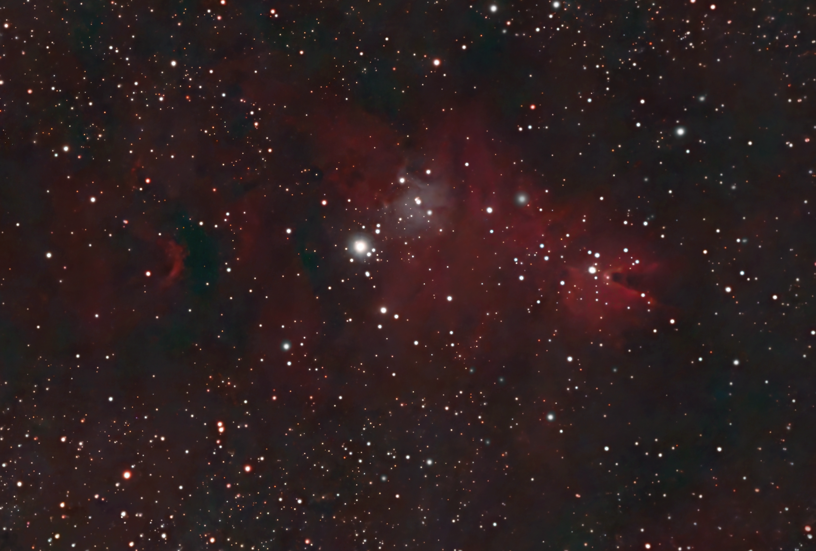 Etendu sur plu de 30 A.L., ce complexe nébuleux souevnt nommé la nébuleuse de l'Arbre de Noël (NGC 2264) est en fait un jeune amas ouvert de faible concentration d'étoiles (une cinquantaine), et comprend la nébuleuse du Cône (à droite) et celle de la Fourrure de Renard., amas de gaz et de poussières. A 2080 A.L. de nous dans la constellation de la Licorne. Assez brillante (mag. 4.1) du fait des étoiles (dont la plus brillante S Monocerotis). Prise de vue d'essai en 2h15 (temps trop court pour bien captuer les nébulosités sombres) au Seestar S30 le 29 Janvier 2026 à Pernes-les-Fontaines.