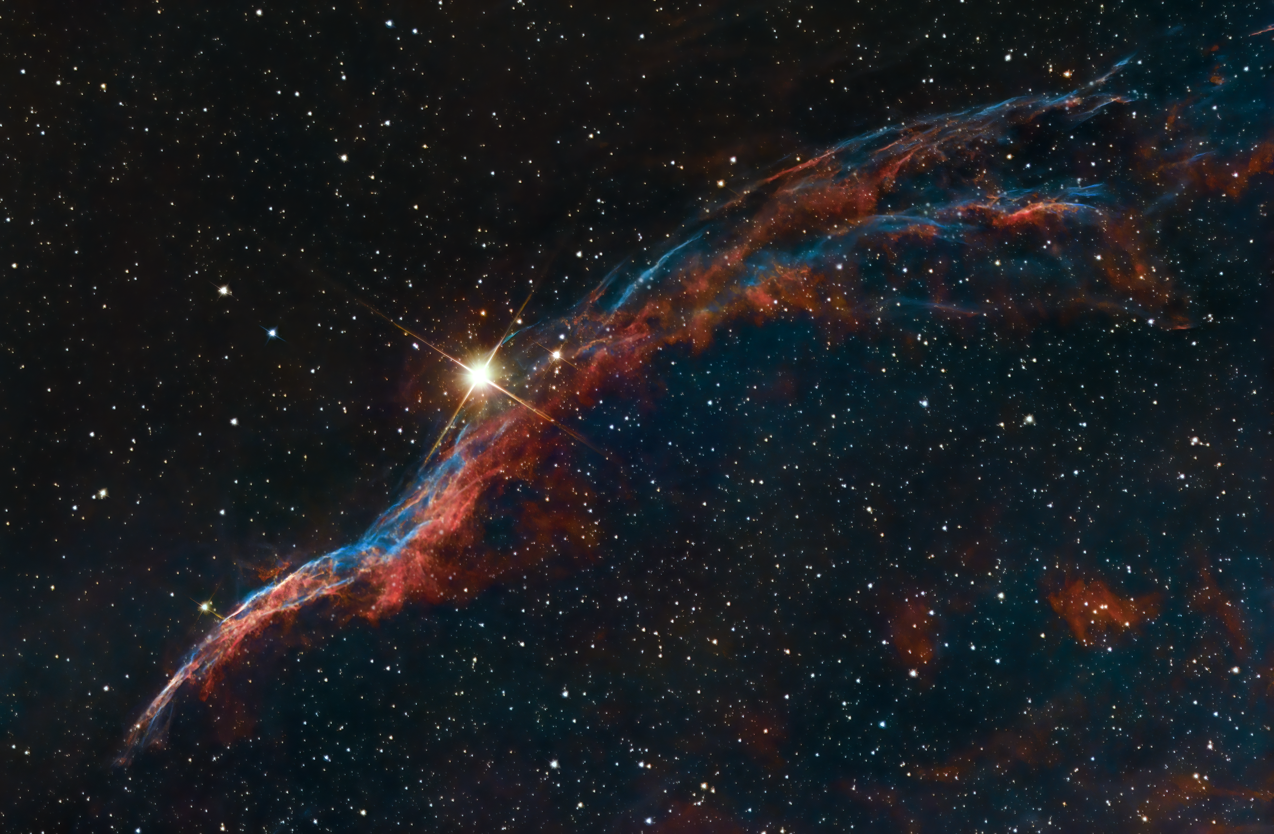 NGC6960 ou Cadwell 34 : la nébuleuse du Balai de Sorcière est un rémanent de supernova située dans la région des dentelles du Cygne au sein de la constellation du même nom. Découvert en 1784 par l'allemand W. Herschel, ce magnifique filament coloré d'une longueur de 50 A.L. se trouve à 2400 A.L. de la Terre ; sa magnitude est de 6.6. Image réalisée après 8 h. de pose les 24, 29 et 30 Septembre 2023 à Pernes-les-Fontaines, 84210.