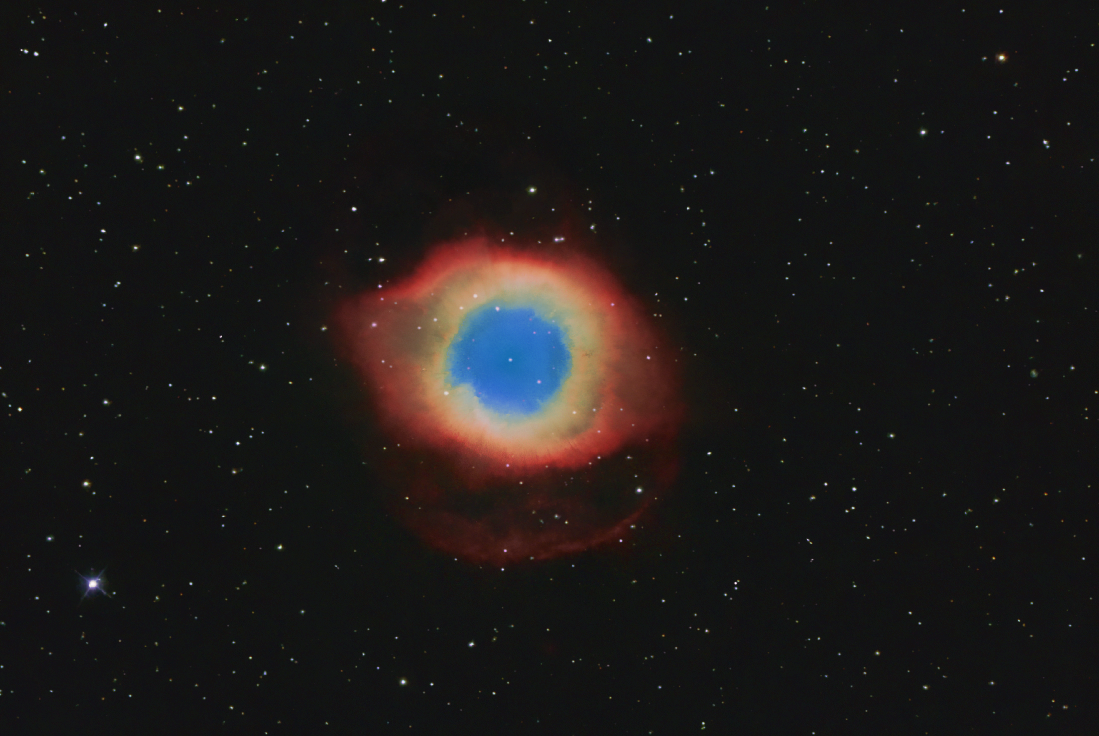 La nébuleuse de l'Hélice NGC 7293 (ou entrée 63 du catalogue Caldwell), est une jolie nébuleuse planétaire de la constellation du Verseau. Egalement surnommée l'oeil de Dieu en raison de sa forme, NGC 7293 est une des nébuleuses planétaires de la Voie Lactée proches de la Terre, à environ 650 A.L. Elle est de ce fait assez lumineuse (magnitude 6.6) et mesure environ 3 A.L. dans son grand axe. Elle contient plusieurs dizaines de milliers de "noeuds cométaires" répartis radialement, sortes de filaments gazeux, avec une tête brillante et une queue évoquant une comète, qui seraient en fait des résidus dus à l'évolution stellaire d'étoiles. Cette nébuleuse a été découverte par l'astronome allemand Karl Ludwig Harding en 1824. 5 h. d'exposition du 23 au 29 Septembre 2024 (durée de visibilité réduite à chaque nuit du fait de sa faible altitude) ; Pernes-les-Fontaines, 84210.