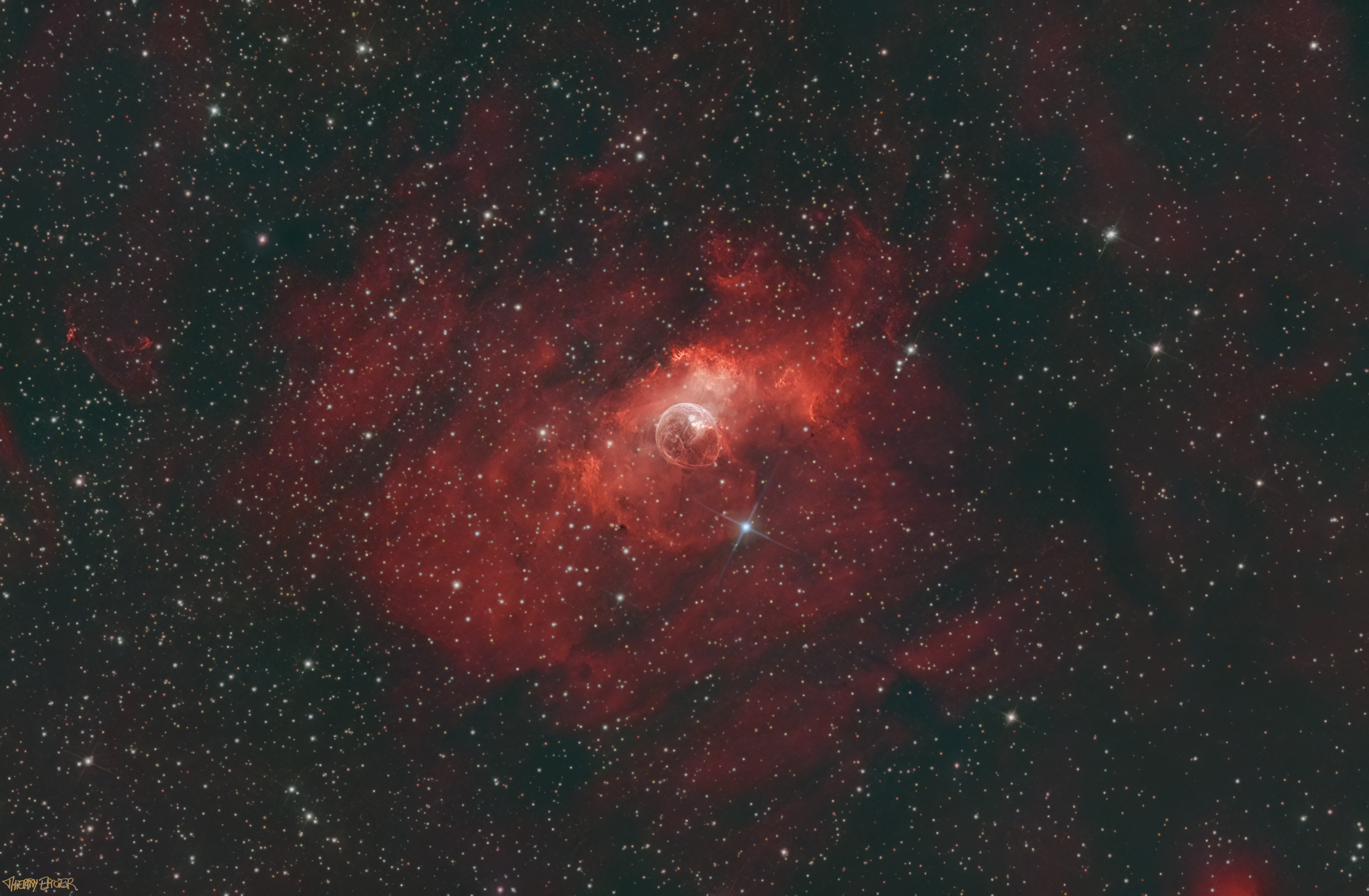 NGC 7635, répertoriée également comme Sh2-162 ou LBN 549 ou Caldwell 11, est prénommée nébuleuse de la Bulle. C'est une nébuleuse en émission (région HII) contenant une bulle de vent stellaire d'environ 7 A.L. de diamètre, située dans la constellation de Cassiopée à environ 7 000 A.L. de la Terre. NGC 7635 a été découverte en 1787 par l'astronome germano-britannique William Herschel. Prise de vues assez longue (faible luminosité : magnitude 11) réalisée les 14, 15, 28, 29 et 30 Novembre 2024 (12h45 de pose) à Pernes-les-Fontaines, 84210.