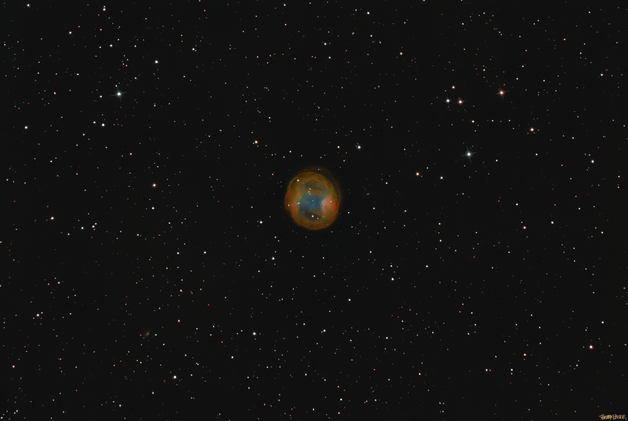 La Nébuleuse planétaire Jones-Emberson 1 (PK 164+31.1), ou nébuleuse du casque de musique est située dans la constellation du Lynx et abrite en son centre une naine blanche de couleur bleue. Découverte en 1939 par Rebecca Jones and Richard M. Emberson, la désignation "PK" provient du catalogue de nébuleuses planétaires établi par les astronomes tchèques LuboÅ¡ Perek and LuboÅ¡ Kohoutek). Mag. 14, distance à la terre 1600 A.L. Pose totale de 9h30 le 31 janvier 2024 à Pernes-les-Fontaines, 84210.