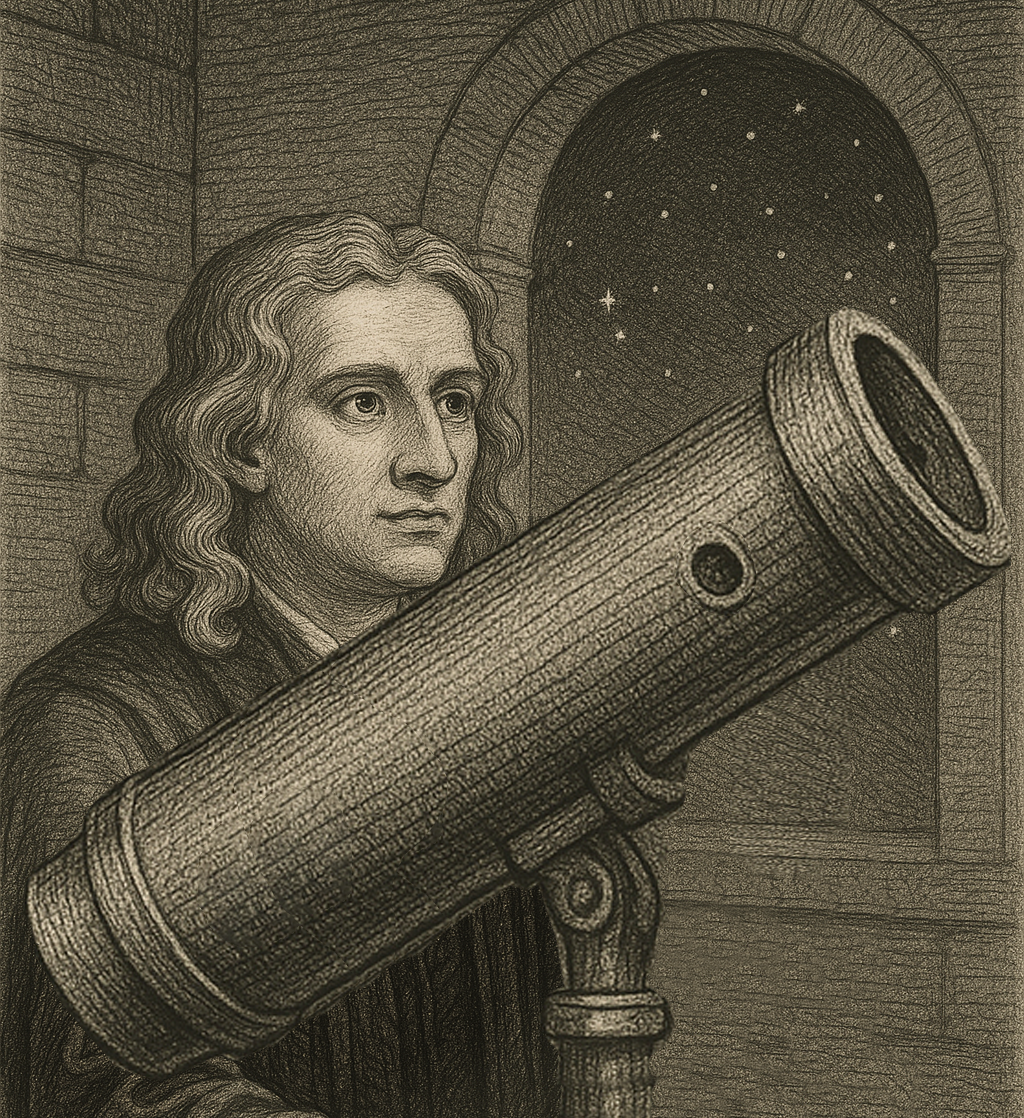 Newton en 1671 et son télescop réflecteur (image générée par A.I.