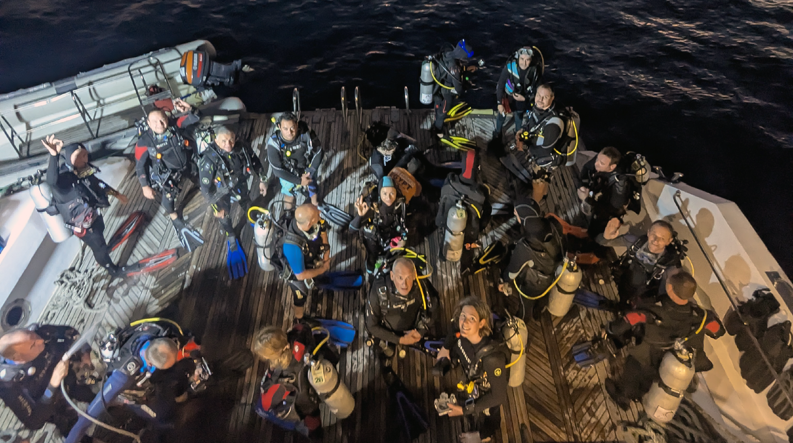 Les phares sont vérifiés, tout le monde se tient prêt sur la plateforme au départ d'une plongée nocturne...