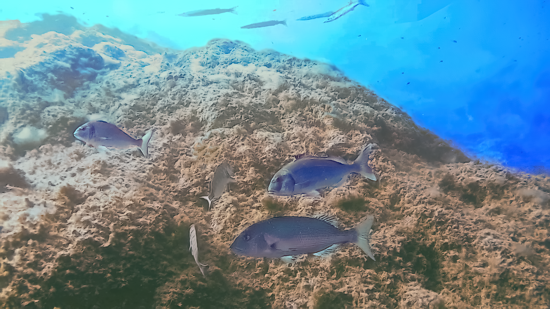 Le denti (ou denté : Dentex dentex) est un semi-pélagique côtier très présent en Méditerranée, mais aussi très chassé. C'est un redoutable chasseur de mollusques, crustacés ou petits poissons. Site de La Gabinière, La Londe, 14/09/2024.