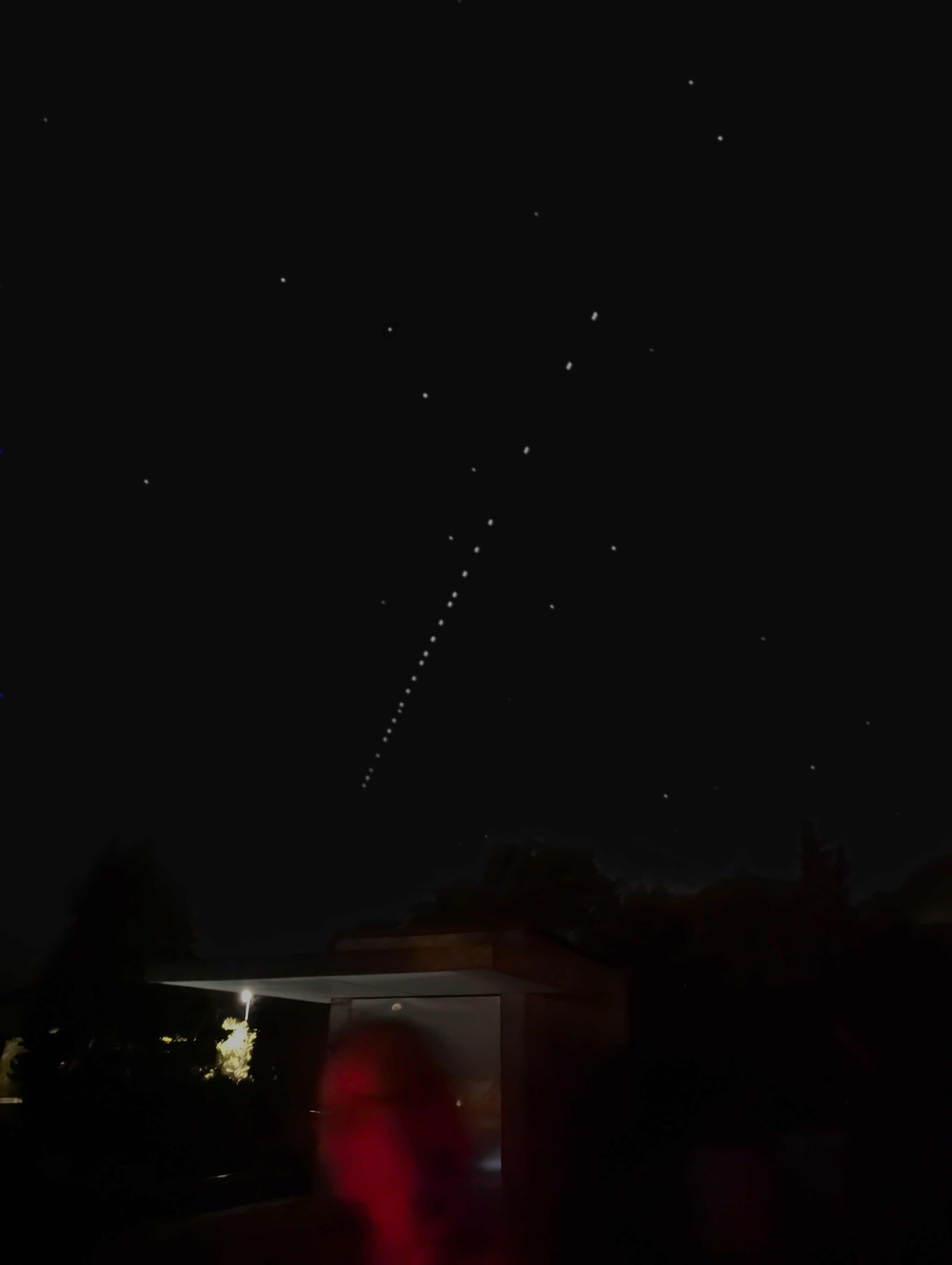 Image prise sur le vif lors d'une soirée d'observation pédagogique à Sérignan. peu après le coucher du soleil, un train de satellites de la société Starlink traverse le ciel et la Constellation de la Grande Ourse. Les satellites sont brillants du fait de la réflexion de la lumière du soleil qui les éclaire de derrière notre planète. Ils "disparaissent" lorsqu'ils s'élèvent à notre vue car ils sont progressivement masqués dans l'ombre de la terre. Image au smartphone prise le 05 Août 2024 (Google PIXEL 6, mode nuit standard, 3 s d'exposition). Sérignan du Comtat, 84830.